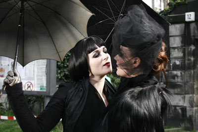 Maria Cyber photo and Comment: Susanne Sachsse as Hella and Katharina Klewinghaus as Medea outside of the central door of the City Graveyard (Mattäus Kirchhof) just before the moment of the hot les kiss. Doing their rehearsal to look so real as great actresses they both are. Many of the people who were passing by would love to participate actively in this scene.