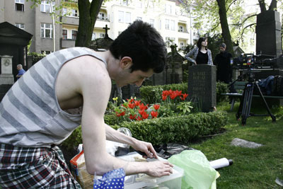 Maria Cyber photo and Comment: Nicholas Fox Ricciardi (Art Department) making the sandwich for the pic nic scene in the City Graveyard (Mattäus Kirchhof), next to the tombstones making brunch while the zombies and dead people are not hungry for sandwich but all the rest of us we were and really in a such a sunny day the green Graveyard looks like a perfect location for a pic nic. I would like to had bring with me, my greek ouzo but no alcohol allowed at the set.